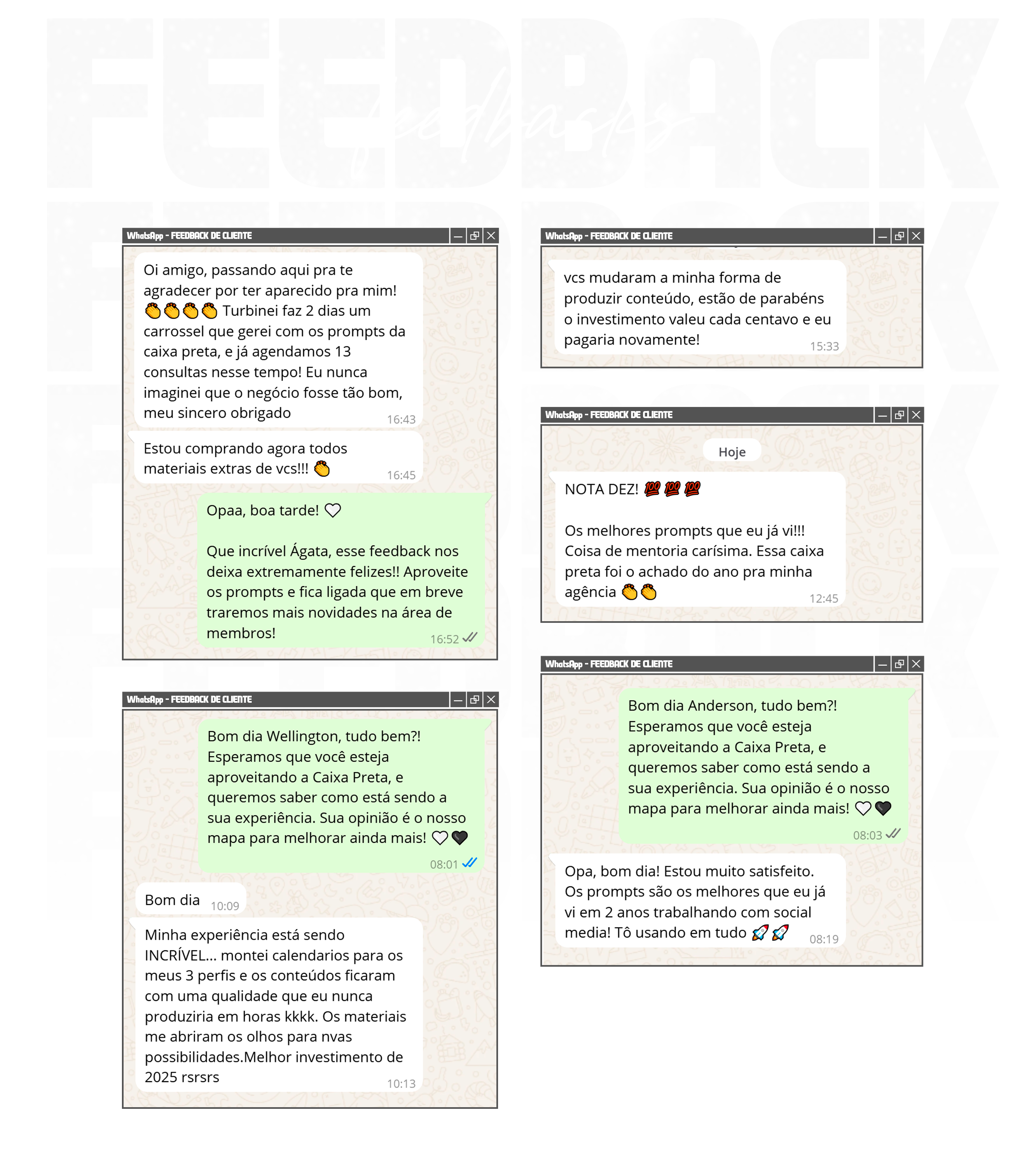 A Caixa Preta foi desenvolvida por especialistas em Engenharia de Prompts e aplica princípios de Psicologia, Copywriting avançado, Storytelling e Growth, de uma forma que você nunca viu igual. A plataforma está sendo constantemente alimentada com novos prompts poderosos para diferentes objetivos, e você terá acesso vitalício com apenas um pagamento.